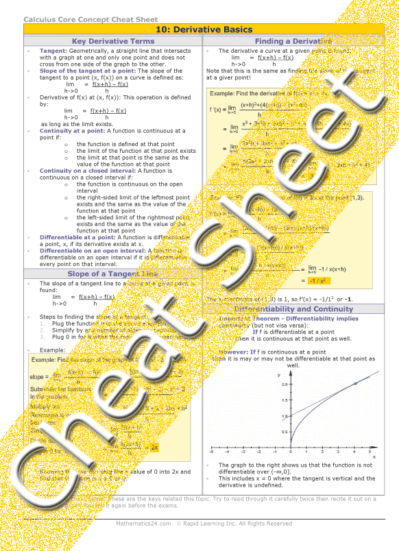 The derivative is one of the most important principles in a Calculus course. This tutorial introduces the derivative, its properties and its operations that are needed in application problems such as the continuity and differentiability of functions.
